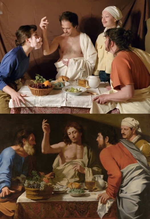 SPFS_1 (bas) « Le Souper à Emmaüs » (circa 1620) de Bartolomeo Cavarozzi. (haut) Reproduction photo de Simone, Flavie, Patricia et Sylvain.