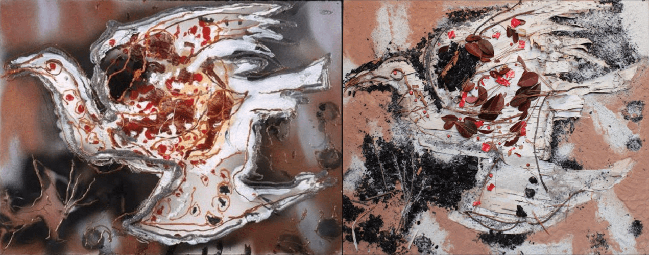 Y&S_4 (gauche) « Sans titre » (1990) de Jean-Paul Riopelle. (droite) Reproduction avec cendre, terre, feuilles et brindilles de Sylvain et Yves.
